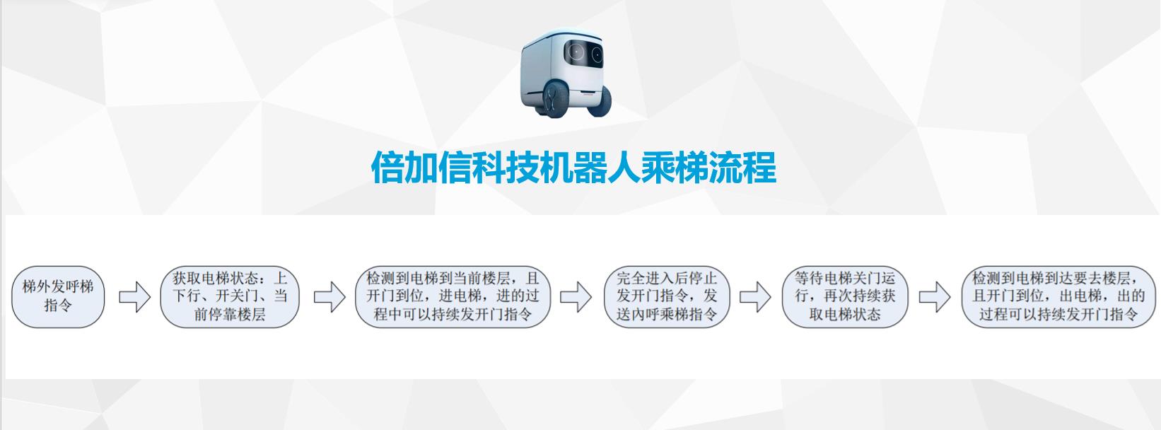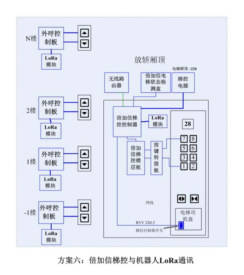 (1)機器人在電梯外,通個Wifi、藍牙、LoRa、Zigbee、2.4G、433M、語音或4G網絡等發送指令倍加信梯控系統,系統自動點亮上樓或下樓按鍵,實現呼梯功能。