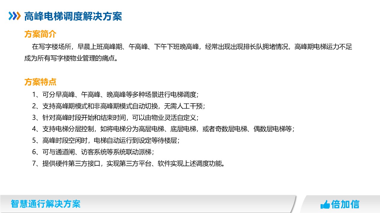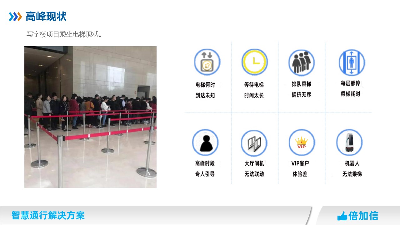 在寫字樓場所,早晨上班高峰期、午高峰、下午下班晚高峰,經常出現出現排長隊擁堵情況,高峰期電梯運力不足成為所有寫字樓物業管理的痛點。