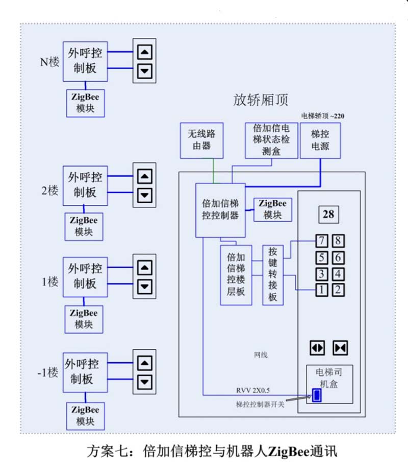 (1)機器人進入電梯后,通個Wifi或4G網絡發送指令給倍加信梯控云平臺,倍加信梯控云平臺收到指令后,將指令發給倍加信梯控系統,倍加信梯控系統自動點亮對應樓層按鍵,比如發去6樓指令,則6樓按鍵自動點亮,電梯送機器人員到6樓。
