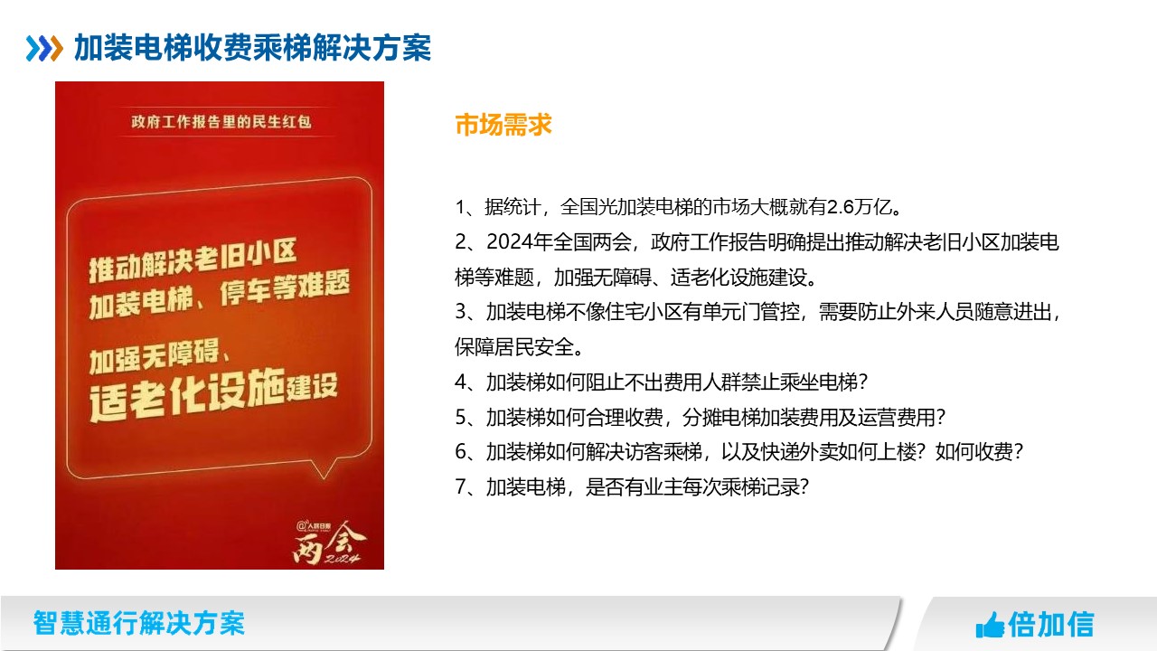 2、2024年全國兩會,政府工作報告明確提出推動解決老舊小區加裝電梯等難題,加強無障礙、適老化設施建設。