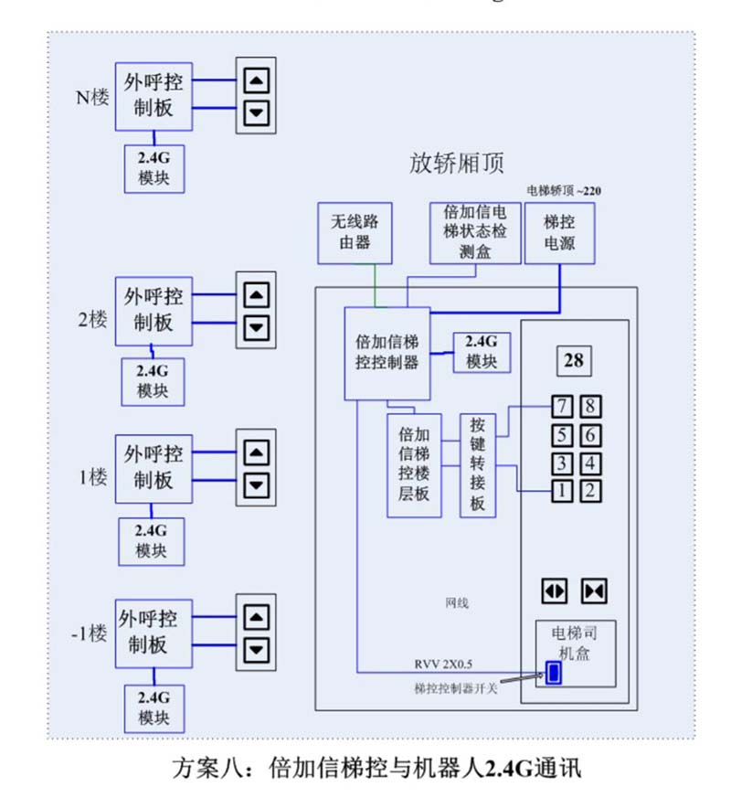 (1)機器人在電梯外,通過2.4G通訊發送指令倍加信梯控系統,系統自動點亮上樓或下樓按鍵,實現呼梯功能。
