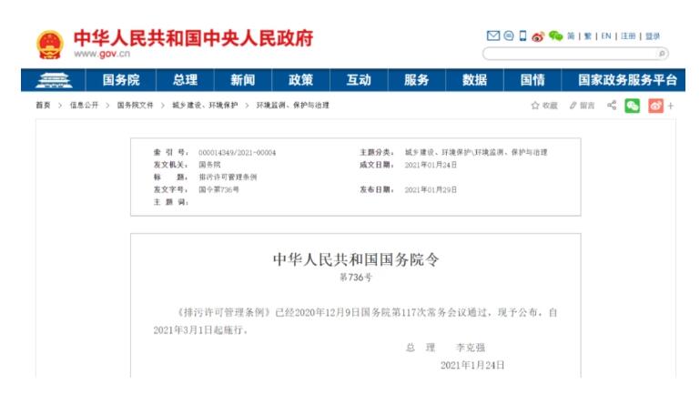 國務(wù)院日前簽署國務(wù)院令,公布《排污許可管理條例》(以下簡稱《條例》),自2021年3月1日起施行。