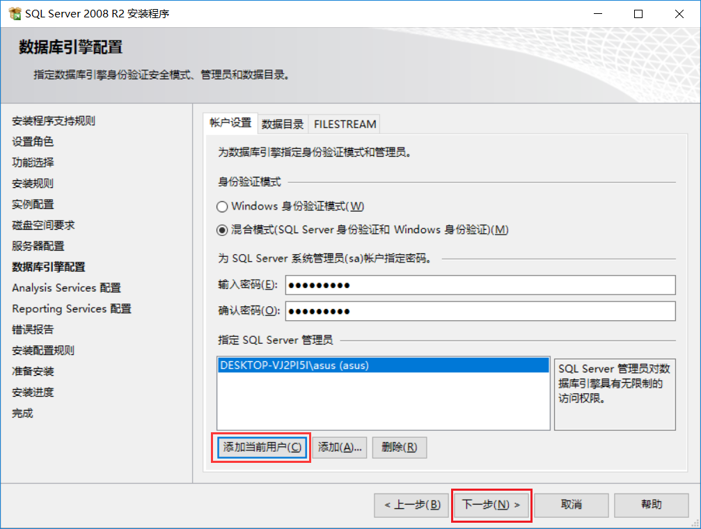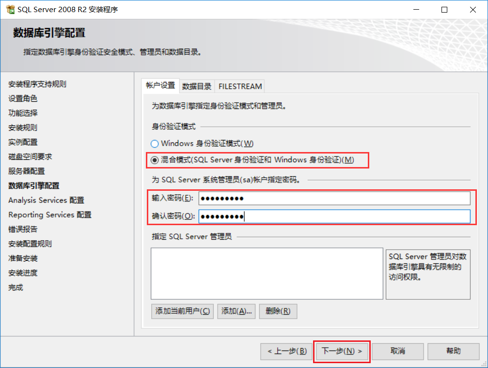 選擇混合模式,輸入密碼,點(diǎn)下一步