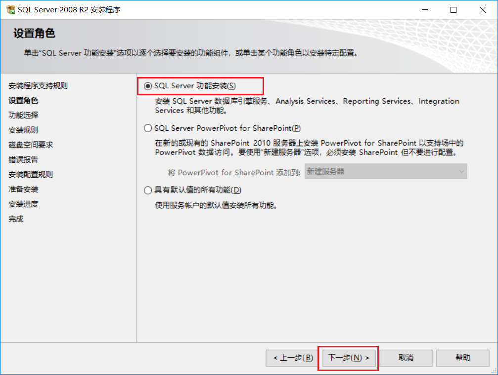 選擇 SQL Server功能安裝 ,點(diǎn)擊 下一步