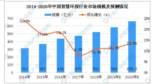 目前,我國環境污染問題已經成為國家和社會關注的焦點,傳統的污染治理方式在預防性、及時性以及精準性等方面有所欠缺。在互聯網技術快速發展下,運用大數據、云計算和物聯網等手段智能化治理污染與保護環境,成為環保行業未來發展的新方向。到2020年,中國智慧環保行業市場規模將突破650億元,市場前景十分廣闊。